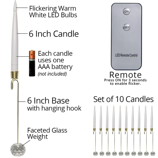 Bring back the tradition of placing candles on your Christmas tree with battery operated, remote controlled LED Christmas tree candles. The faceted glass weights of these elegant flameless taper candles refract light like a crystal ornament, adding to the beauty of your Christmas tree. LED bulbs and replaceable batteries ensure you’ll be enjoying these Christmas tree candles for many years. Press and hold the “on” button for flickering light display.
