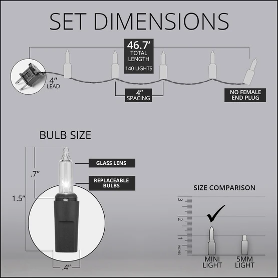 Take your classic Christmas display to the next level with the mesmerizing illumination of chasing lights! Our clear mini lights offer superior quality lighting effects at affordable prices making them the ideal choice for a variety of decorating projects. Wrap brilliant, clear lights around trees and railings for a shimmering display of holiday cheer any time of year!