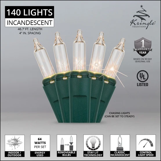 - 140 Clear chasing mini lights spaced 4″ apart on green wire, 46.7′ total length