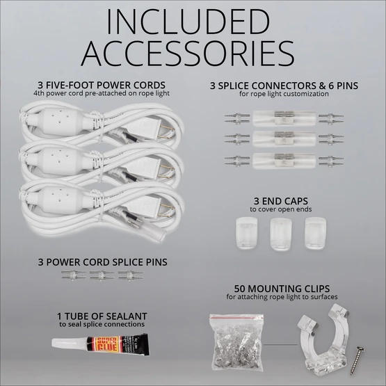 - Includes enough power accessories to create four separate runs of rope light