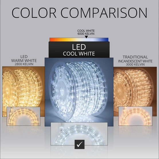 Do you love that icy look, but live in a warm climate? Look no further than our cool white rope light! Your lighting designs will stand the test of time when you opt for the long lasting, weather resistant construction of commercial grade LED rope light spools. 1/2 inch diameter rope light is extremely versatile and can be cut to create custom lengths, just follow the visible splice mark indicators found on the flexible PVC tubing to achieve your desired measurement. Our LED bulb tip radiates light 180 degrees to give you greater light coverage. LED rope light saves on energy and always remains cool to the touch. Decorate decks, walkways and windows with cool white rope light. There are so many uses for this versatile product you won’t want to choose just one!