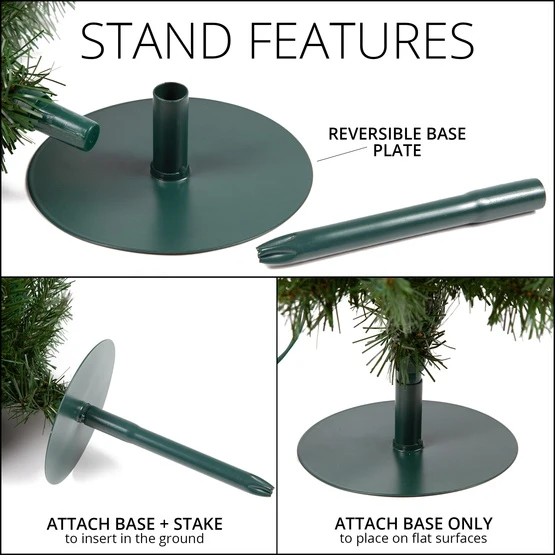 These walkway and tabletop Christmas trees offer versatile, adorable holiday magic you can use inside or outside. Their sturdy base assembly lets you stake them into the ground or pots and planters, with long leads that make them easy to connect together. Or convert the base assembly to a pedestal and use them indoors as tabletop Christmas trees. The natural looking dark green tips are 2-ply for weather resistance. Stake secures trees 8″ deep in ground.