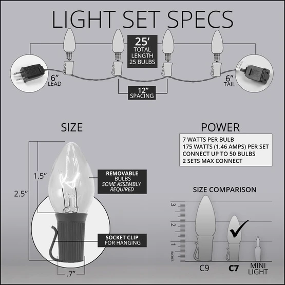 - 25 clear twinkle C7 lights on green wire, 25.0′ total length.