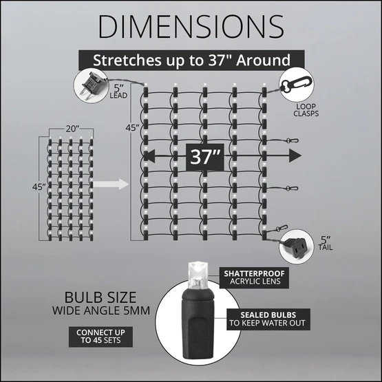 Make your holiday decorating easier with cutting-edge StretchNet Pro trunk wrap net lights. Stretchable enough to expand from 20 inches x 45 inches up to 37 inches x 45 inches, this trunk wrap gets the job done! The secret is a unique stretchable cord woven into the net, making installation a snap in just minutes! Simple loop clasps attach the ends of the net around the tree. Its that simple! Brilliant blue StretchNet trunk wrap is perfect for all your favorite holidays.