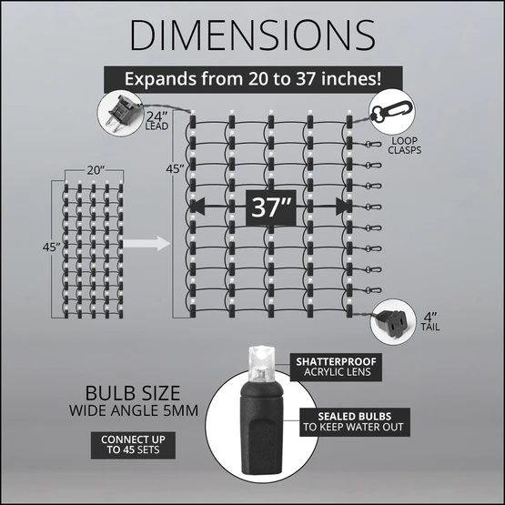 - 50 cool white 5mm LED stretch net lights on a 20″ x 45″ white wire