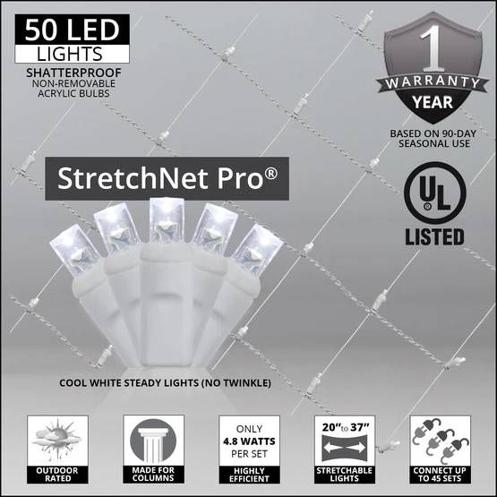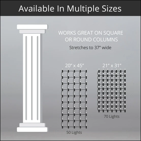 The holidays just got brighter with new and improved StretchNet Pro column wrap. Flexible enough to expand to fit a variety of column widths, this wrap does it all! The secret is a unique stretchable cord woven into the net, making installation a snap in just minutes! Decorate hassle free with its simple loop clasps that attach at both ends of the net and presto! Youre done! Captivating cool white StretchNet column wrap is perfect for enhancing your most special occasions, from the holidays to weddings and parties, and so much more!