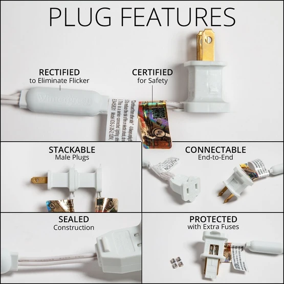 - Cover more surface area with fewer power sources with convenient stackable plugs