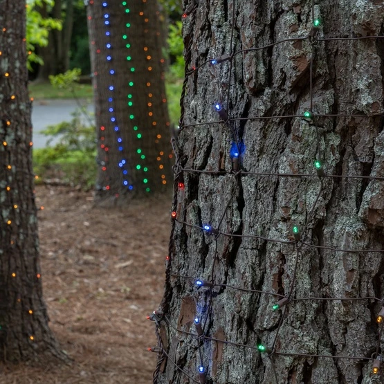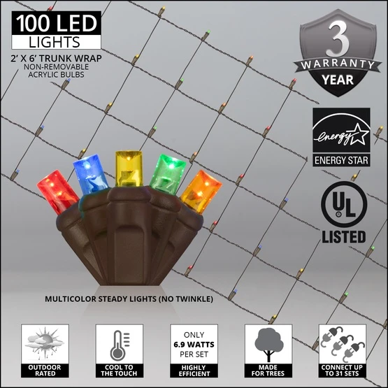 Cheerful illumination has never been this easy and fun! Commercial grade multicolor LED trunk wraps feature energy efficient, weather resistant construction and vivid coloration. Even after years of use adorning your trees, these lights are sure to delight! Wrap trees with ease and illuminate your yard in festive, full spectrum light!