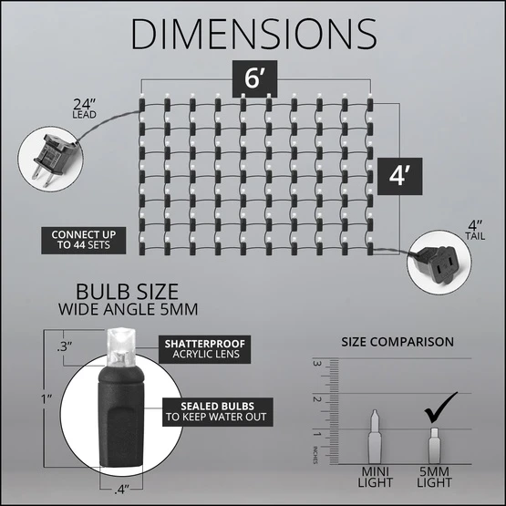 - 70 warm white 5mm LED SoftTwinkle net lights on a 4′ x 6′ green wire