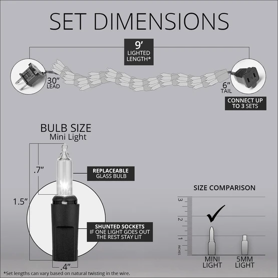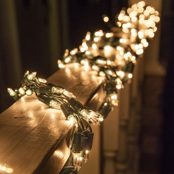 These garland lights are one of the hottest lighting display items around! Our clear garland lights on green wire make a great decoration for use against green backgrounds such as foliage, or anywhere you want the brilliant spirit of the holiday season to shine through. Wrap banisters and railings or spiral down column for lush, beautiful lighting you’re sure to love.