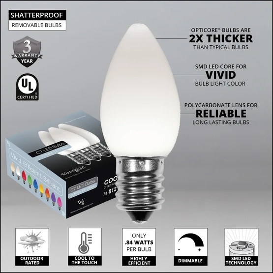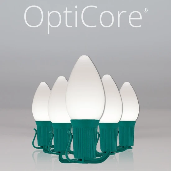 Explore all of the endless possibilities for displaying cool white LED Christmas lights around your home this year. Energy efficient cool white LED bulbs create a perfect backdrop for any holiday decor to shine, and our commercial quality, weather resistant construction ensures your lights will maintain professional display for years. Opticore bulbs emit superior, vibrant light while maintaining the unbreakable, energy efficient benefits you want. Plus, these string lights are end-to-end connectable, so you can connect different lengths together up to 1,000 feet (960 max watts). Green wire is the perfect choice for displaying lights on bushes or a wide range of other natural backdrops. Hang these lights along the roof, across a porch or fence, or wrap them around trees for your most exciting holiday light display ever!