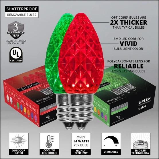 Your Christmases will be merry and bright with these festive green and red holiday lights! Our commercial quality strings and energy efficient red and green LED bulbs combine to create a weather resistant, professional quality display you will love to show off! Opticore bulbs emit superior, vibrant light while maintaining the unbreakable, energy efficient benefits you want. Plus, these string lights are end-to-end connectable, so you can connect different lengths together up to 1,000 feet (960 max watts). Green wire is the perfect choice for displaying lights on bushes or a wide range of other natural backdrops. Hang these lights along the roof, across a porch or fence, or wrap them around trees for your most exciting holiday light display ever!