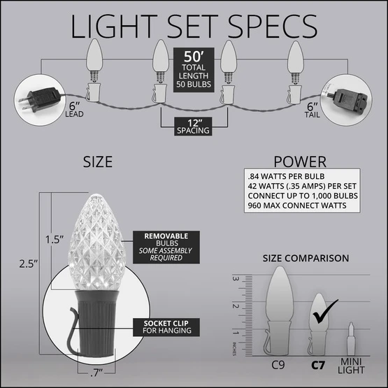 - 50 commercial grade C7 green and red lights with 50′ of 18 gauge green wire