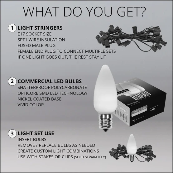 - Commercial string light sets include bulbs and light strings; to assemble, simply twist bulbs into light sockets