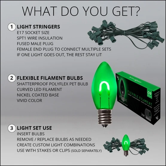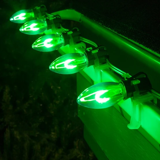 - 15 commercial grade C9 green lights with 15′ of 18 gauge green wire