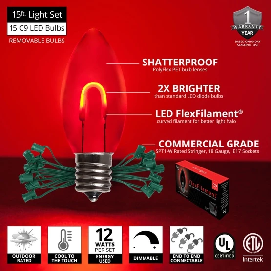 - 15 commercial grade C9 red lights with 15′ of 18 gauge green wire