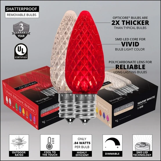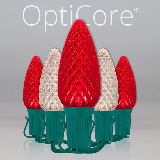 Candy Cane themed lights are the perfect treat for your outdoor Christmas light display! Our commercial quality strings and vibrant warm white and red LED bulbs combine to create a long lasting, weather resistant display you will love. Opticore bulbs emit superior, vibrant light while maintaining the unbreakable, energy efficient benefits you want. Plus, these string lights are end-to-end connectable, so you can connect different lengths together up to 1,000 feet (960 max watts). Green wire is the perfect choice for displaying lights on bushes or a wide range of other natural backdrops. Hang these lights along the roof, across a porch or fence, or wrap them around trees for your most exciting holiday light display ever!