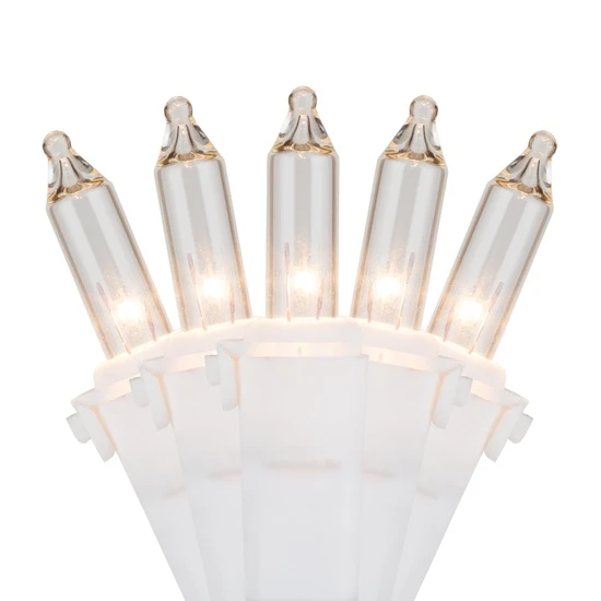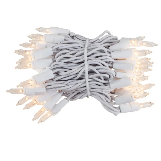 - 100 Clear mini lights spaced 6″ apart on white wire, 50.5′ total length
