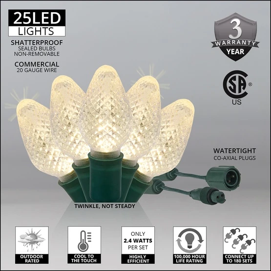 - 25 Warm White Twinkle C7 Commercial LED lights spaced 12″ apart on green wire, 25.0′ total length.