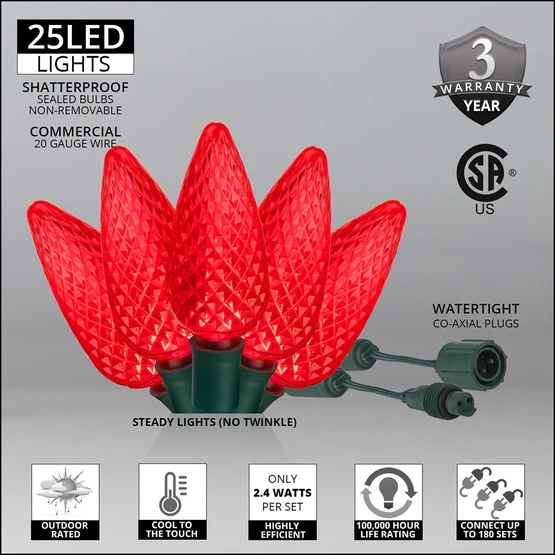 - 25 Red C9 Commercial LED lights spaced 12″ apart on green wire, 25.0′ total length.