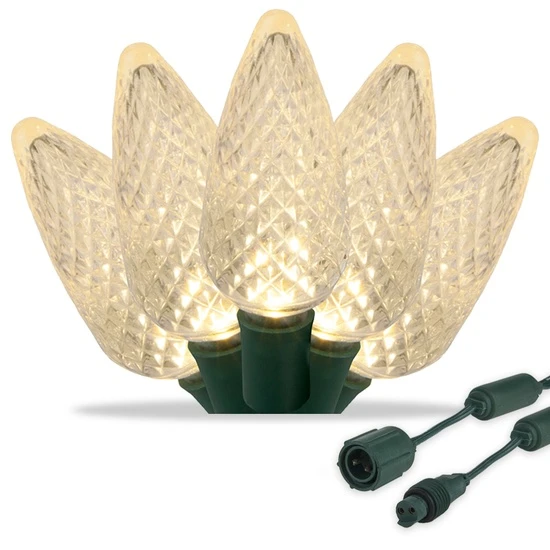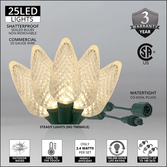 - 25 Warm White C9 Commercial LED lights spaced 12″ apart on green wire, 25.0′ total length.