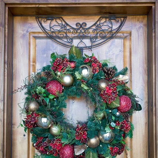 Your wreath never looked so good! Introducing a decorative wreath hanger artistically stylized with a deco holly leaf and berry design treatment. Made with decorative metal, these Christmas classic holly shapes complement any wreath and add a great finishing touch to your front door!