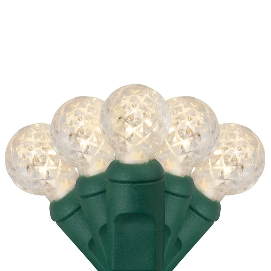 Mini globe-shaped 12mm diameter nuggets of light that offer brilliant light disbursement through diamond faceted bulb design, creating a radiant light halo to brighten the night. Our warm white color is specifically designed to closely match clear incandescent lighting, radiating soft elegant light for holidays and weddings. Use warm white G12 Christmas lights to wrap indoor trees or bring outside to add vibrant illumination to greenery and bushes.