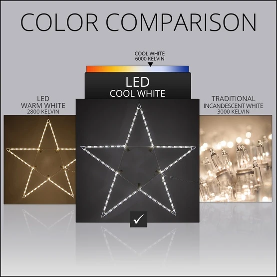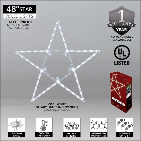 Bring the wonder of the night sky to your Christmas lights display with these folding stars featuring cool white 5mm LED mini lights! You’ll experience long lasting, superior quality construction and brilliant illumination while saving time and money with this convenient, energy efficient LED Christmas decoration. Hang these large, vivid stars above the mantel, across the porch or among the branches of large outdoor trees to add festive glow indoors or out, then fold them up and store away in a quick, hassle free process!