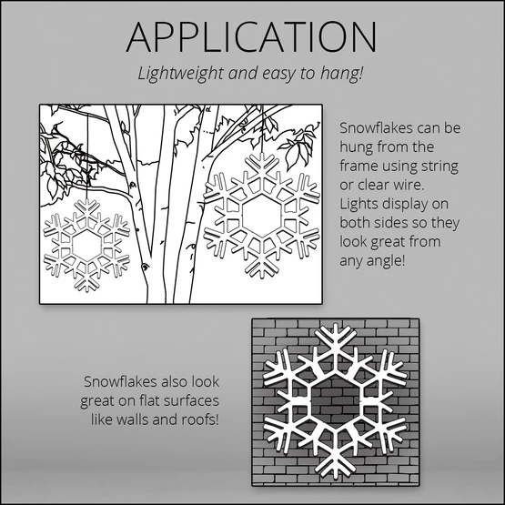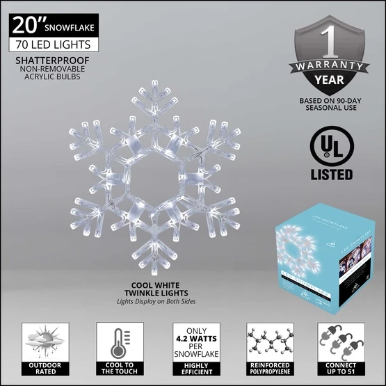 Add the mesmerizing effect of snowflakes shimmering in the moonlight when you add 20″ twinkle LED snowflakes to your Christmas lights display! You’ll love the highly durable, weather resistant construction and vivid illumination of 5mm Cool white twinkle LED lights! Create a magical outdoor display when you hang these stunning snowflakes across the porch or suspended among tree branches, then when the holidays are over just fold them away for quick and convenient storage!