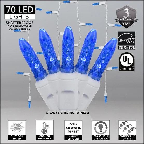 - 70 blue M5 mini lights on white wire, 7′ lighted length; 6″ lead, 6″ tail