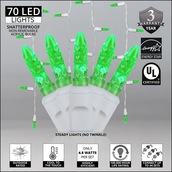 - 70 green M5 mini lights on white wire, 7′ lighted length; 6″ lead, 6″ tail