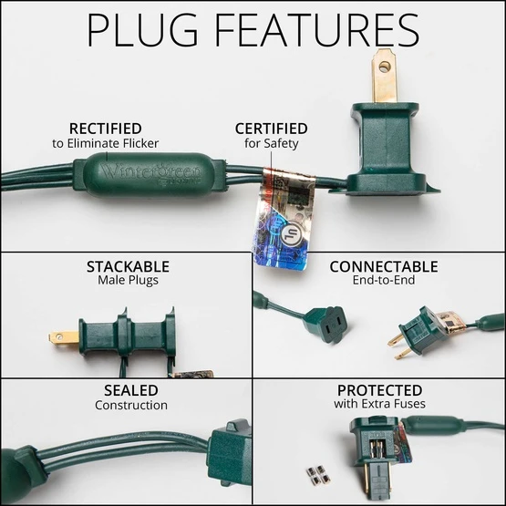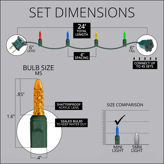 - 70 Multicolor M5 LED lights spaced 4″ apart on green wire, 24.0′ total length.