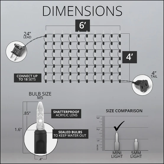 - 100 warm white M5 LED net lights on a 4′ x 6′ green wire