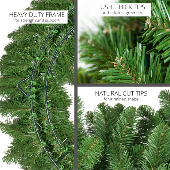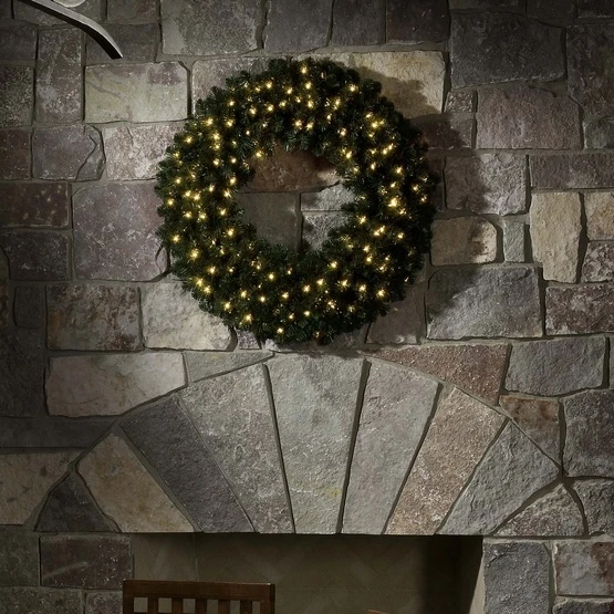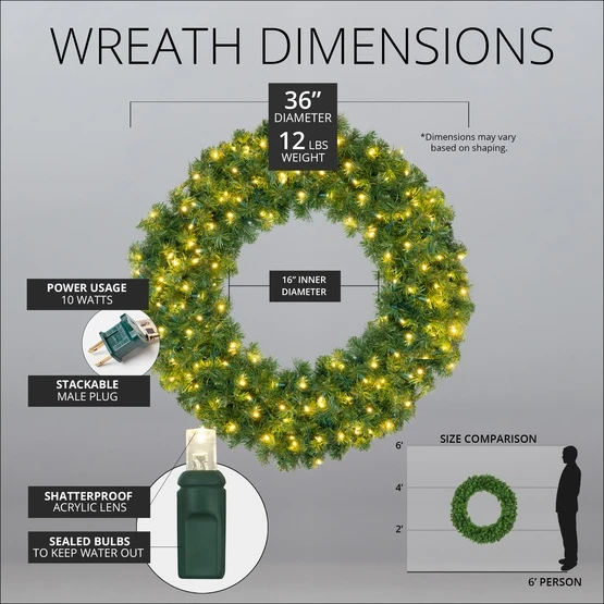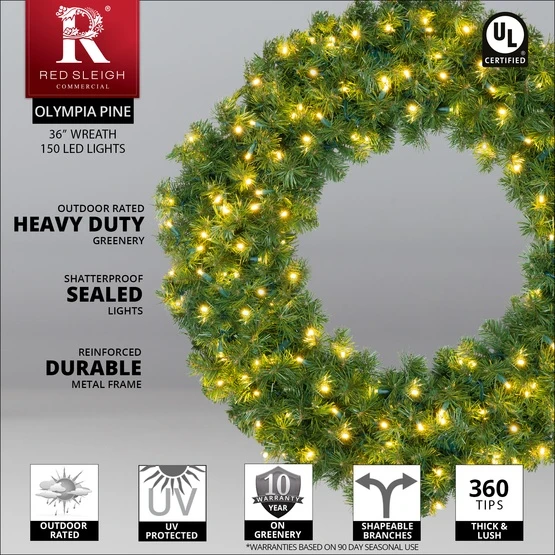 - 36″ Olympia Pine prelit wreath, brightly lit with 150 warm white LED lights