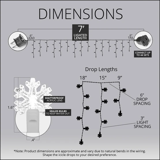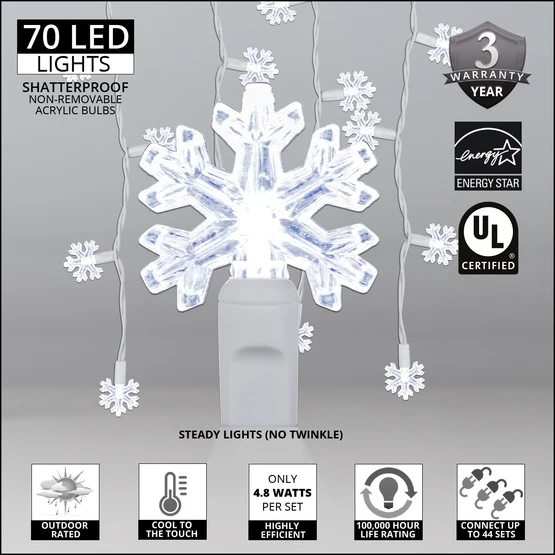Let it snow this Christmas! You’ll have yourself a merry little Christmas when you spend less time worrying about your energy bills and the life of your lights and more time enjoying the stunning, professional display of LED snowflake icicles lights! Hang these ice cold, cool to the touch beauties indoors or out and captivate guests with snowflakes suspended from the roof or even along tree branches!