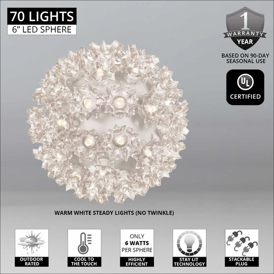 Create elegant lighting for weddings, holidays and events with warm white starlight spheres! These professional quality, brilliant orbs feature long lasting, energy efficient LED bulbs radiating light in all directions. The lead cord provides plenty of length to hang starlight spheres from tree branches, overhangs and across event spaces. Cast a cozy glow over social gatherings, outdoor landscapes and indoor parties with the warm illumination found in these brilliant balls of light!